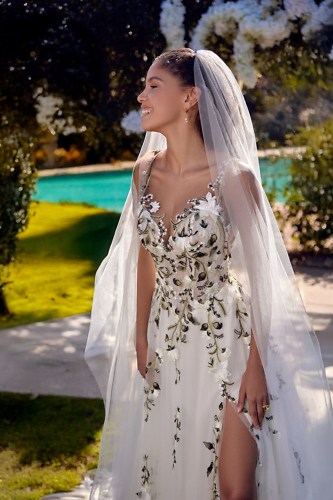 Wunderschönes, A-linie Brautkleid mit basque Taille. Das Brautkleid besticht durch die zauberhaften grünen Blumen Applikationen. Dieses Hochzeitskleid kann auch ganz in Ivory bestellt werden. Das Brautkleid ist bis Grösse 58 bestellbar.