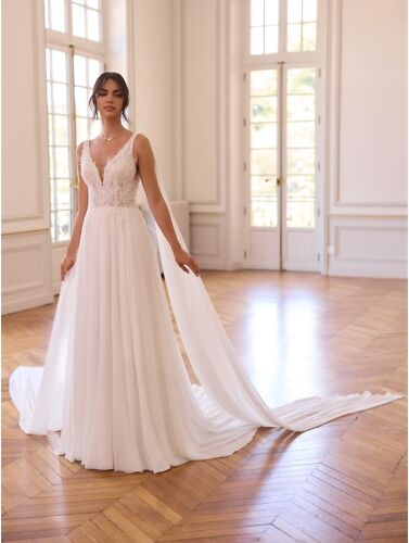 Modernes Brautkleid in A-Linie. Gefertigt aus hochwertiger Spitze und Chiffon.