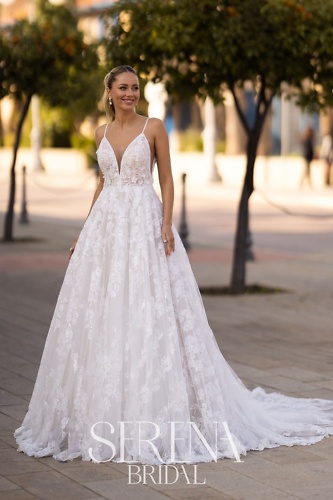 Wunderschönes Brautkleid von Serena by Monica Loretti mit allover Spitze für einen traumhaften Prinzessinnenauftritt.